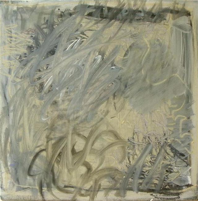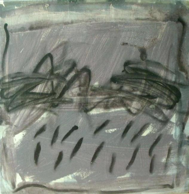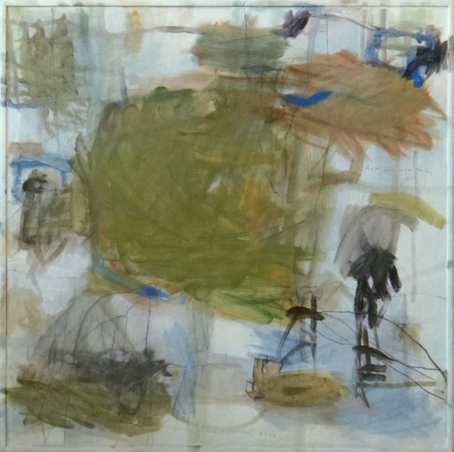 Landschap met wegtrekkende regen, acryl op hout 61x61cm