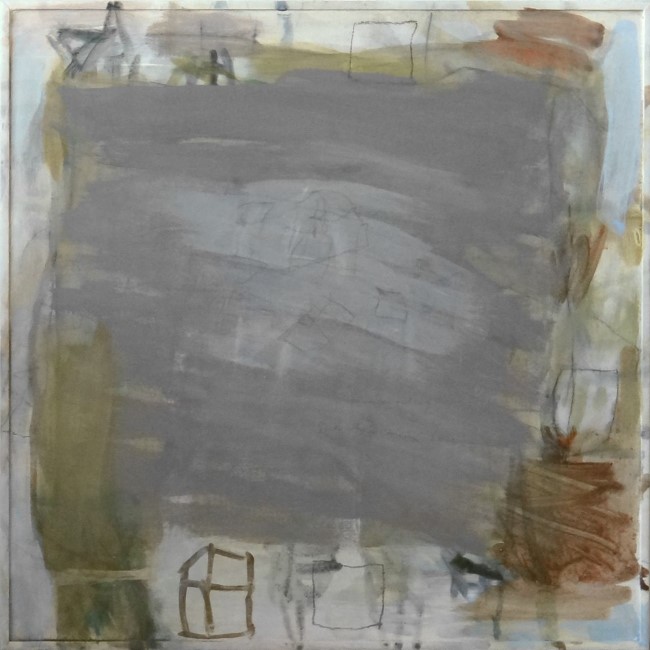 Huizen zijn het makkelijkst, olieverf en potlood op hout, 61x61 cm